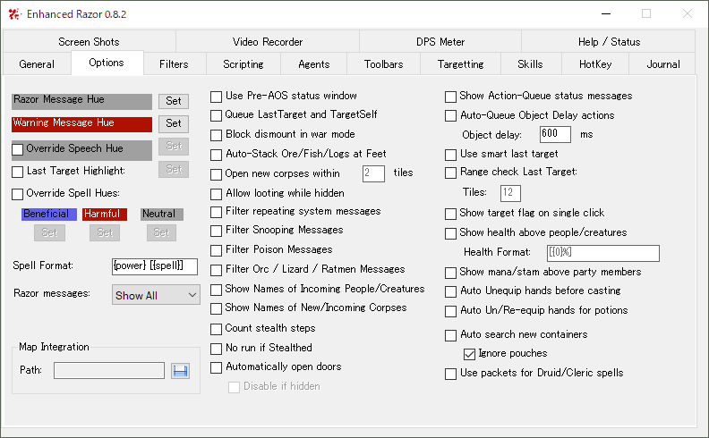 Spell Format: {power} [{spell}] キャラクターの頭上に表示する呪文のフォーマット。力の言葉が「{power}」呪文名が「{spell}」 Razor messages: [ Show All ] REからのメッセージで、クライアントに表示するものをドロップダウンメニューで選択 - 左下の Map Integration 枠